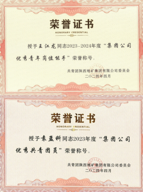 4月26日,在陜西地礦集團團委慶祝中華人民共和國成立75周年團青先進表彰暨“青春為中國式現(xiàn)代化挺膺擔當”主題培訓(xùn)會上,我公司王江龍同志榮獲陜西地礦集團2023-2024年度“優(yōu)秀青年崗位能手”稱號,袁孟科同志榮獲陜西地礦集團2023年度“優(yōu)秀共青團員”稱號。