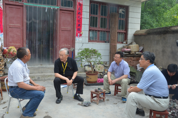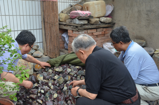 上山察看后,老部長又來張華溝礦點劉吉村村民王新海的院子,察看了當?shù)卮迕耖_采的瑪瑙礦石,調(diào)研瑪瑙石礦民采情況,并在村民院子,饒有興趣的與我隊寶玉石礦項目部技術(shù)人員和村民進行了交流,關(guān)切地詢問技術(shù)人員的數(shù)量、生活及車輛租用費用等情況。項目負責(zé)高虔認真地一一回答了老部長的問詢。
