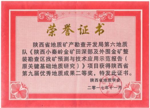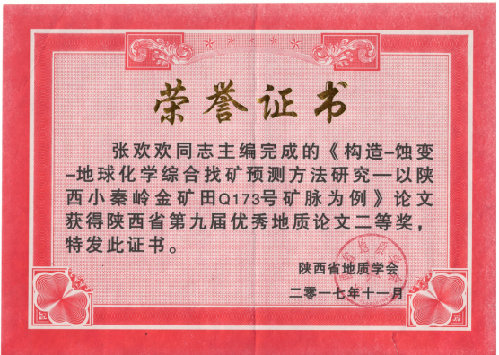 由我隊編制完成的“陜西省小秦嶺金礦田深部及外圍金礦整裝勘查區(qū)找礦預(yù)測與技術(shù)應(yīng)用示范(原關(guān)鍵基礎(chǔ)地質(zhì)研究項目)報告”獲陜西省第九屆優(yōu)秀地質(zhì)成果二等獎;該隊地質(zhì)調(diào)查所張歡歡同志撰寫的“構(gòu)造-蝕變-地球化學(xué)綜合找礦預(yù)測方法研究—以陜西小秦嶺金礦田Q173號礦脈為例”一文獲優(yōu)秀地質(zhì)論文二等獎。