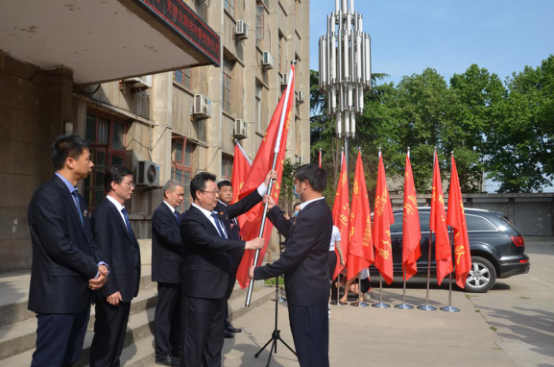 圖為黨委書記、執(zhí)行董事劉曉東為黨支部授旗