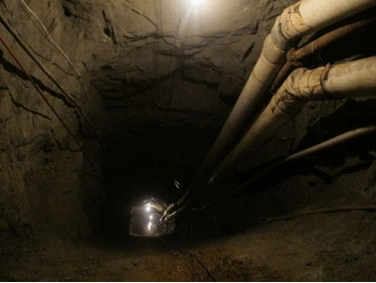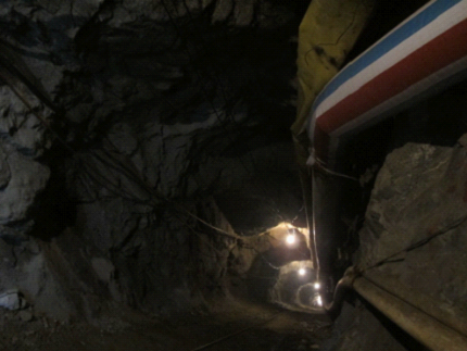 走進(jìn)平硐,硐中空氣比較新鮮,地面水不多、尚且平整,劉總經(jīng)常下井,行走很快。一路上,我們跌跌撞撞,250坑道明顯沒有上周五下過的898豎井坑道標(biāo)準(zhǔn),坑道不平整,局部地方高度只有1米8多左右,學(xué)習(xí)小組成員都不小心被磕著,幸好帶有有安全帽,不然就見血了。在1300多米的平硐中,劉總、董經(jīng)理和譚坑長給我們介紹著洞壁上的巖石、巖性和破碎構(gòu)造帶、石英脈侵入等地質(zhì)現(xiàn)象,我們受益非淺。