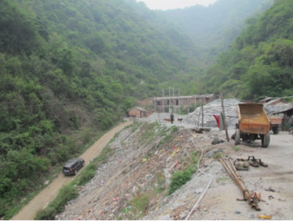 繼續(xù)沿山路前行,走到?jīng)]了路的地方,開始越野路段。這是一個由坡道、河流、巖石組成的山地路段,我們充分體驗(yàn)了什么是拉力越野。車搖搖晃晃的開了大約2公里,我們的頭、腿、膝蓋不同程度的都要和車親密接觸。10多分鐘后,兩車東倒西歪地駛到了目的地,由于位于半山腰上的項(xiàng)目部的道路坡度大、并且非常狹窄,其中一臺車放棄了上山,停在了山腳下。