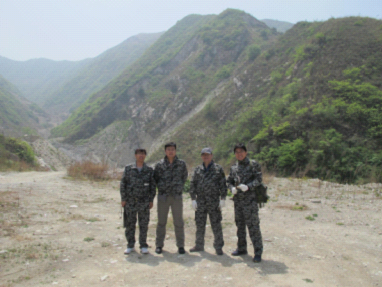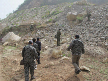 我們今天的任務(wù)是沿著山溝完成1.8公里的剖面修測工作,然后再開路上山,看一個典型的含金礦帶剖面,再沿山脊返回出發(fā)地。工作開始后,小組成員躍躍欲試,但很快看出了我們的差距,首先是野外工作經(jīng)驗的巨大差距。為了獲得剖面起點標本,我們必須翻下高約20米、近60度的滿是大小碎石的亂石斜坡.項目組成員很快下到了溝底,我們費了不小的力氣,在一名項目組成員的帶領(lǐng)下,繞道走了一條相對平坦的下坡道才下到溝底。完成點的工作后,緊接著需要再上這個陡坡,我們都很狼狽,沒有幾位專業(yè)地質(zhì)隊員輕松,我們手腳并用,還時不時踩塌亂石,腳后滾石嘩嘩作響。